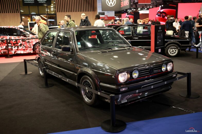 Proche de cette autre Golf GTI, est présente sa petite sœur, sortie quelques années après : la Volkswagen Golf II GTI. Elle est plus imposante et plus lourde que le précédent modèle. En effet, c’est le modèle qui a introduit la culasse 16 soupapes, présente sur l’exemplaire exposé, permettant une puissance allant jusqu’à 139 ch. Cet exemplaire, comme tous ceux présents au salon Rétromobile, n’a pas été choisi au hasard par la marque allemande : celui‑ci est paré d’un kit carrosserie d’époque, renforçant son intérêt d’être mis en valeur dans ce salon.