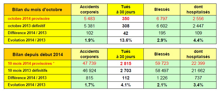 L’Observatoire National Interministériel de la Sécurité Routière (ONISR) vient de publier les chiffres des accidents mortels survenus sur les routes en octobre 2014 et l’année se termine mal.
