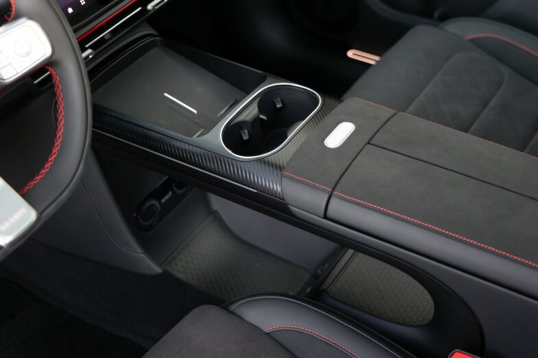 Lors de notre essai du nouveau Smart #5 Brabus, le premier contact avec l’habitacle révèle une ambition manifeste de montée en gamme. Le constructeur automobile germano-chinois vise une expérience plus premium, et cela se ressent dès qu’on s’installe à bord. La première impression est celle d’un très bon confort : les sièges avant sont larges et garnis avec soin. Smart a également soigné les surfaces au contact des mains : garnissages en microfibre, mousses généreuses sur les contre-portes et une disposition visuelle originale qui détonne agréablement dans le segment. Toutefois, même si le choix de plastiques gris et lisses autour de la console centrale et des commandes de vitres laisse à désirer, nous avons apprécié, au-delà de son aspect high-tech et immersif, l’architecture intérieure du Smart #5 Brabus. On est à bord d’une « vraie voiture » qui est pour son habitacle, plus proche d’une voiture thermique que d’une voiture électrique. La console centrale massive en est le meilleur exemple.
