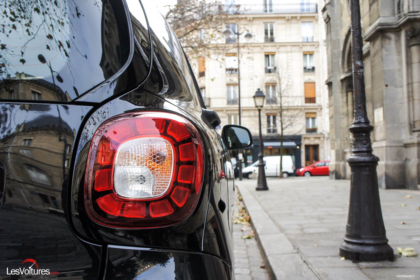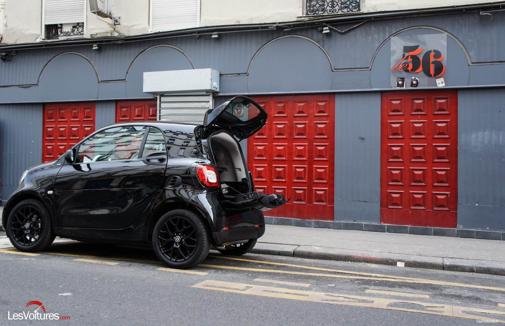 Dès le premier regard, on se rend compte que la silhouette originelle est respectée et le design largement amélioré pour coller à notre époque, tout en exprimant un raffinement ! Alors que la 1ère génération de la Smart mesurait 2,50 m de long, la nouvelle Fortwo mesure 2,69 m, comme la seconde génération. Son style est également très fun. Lors de notre essai, la Smart Fortwo a éveillé la curiosité des passants et de nombreux regards dans la circulation. Ses formes sont épurées chics, adorable et parfois un peu agressives. Notamment pour notre modèle d’essai, la Smart Fortwo Passion (52 kW/71 ch). Toute de noire vêtue, elle profite extérieurement du toit panoramique (option : 400 €) et du « Pack sport » (600 €) qui inclut : les superbes jantes noires de 16″, l’abaissement du train de roulement de 10 mm et une ligne d’échappement chromée.