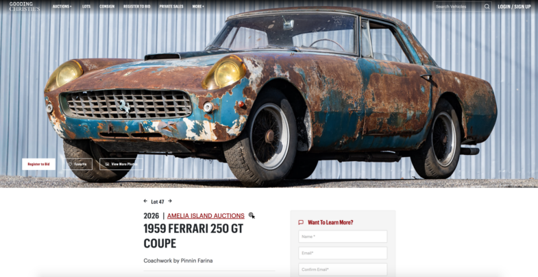Une vie entière enfermée dans une grange, avant de revenir sous les projecteurs. Pour tout savoir sur cette Ferrari 250 GT Series I Pinin Farina Coupé, cliquez sur l’image située ci-dessous pour accéder au site web Gooding Christie’s, l’entreprise qui a organisé la vente aux enchères officielle du Rétromobile 2026.