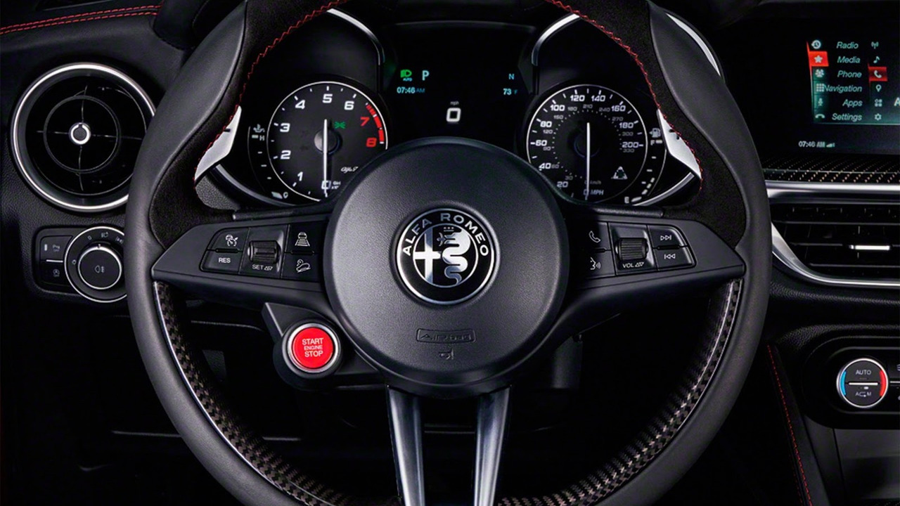 L’habitacle de cette voiture familiale regorge de sportivité. Les éléments de la finition Quadrifoglio sont les mêmes que la Giulia avec, entre autres, des inserts en carbone, les sièges Recaro et une sellerie noire.