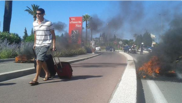 Le périphérique a été rouvert vers 8h00 mais avec de très forte perturbations. Les villes de Marseille et Toulouse ont aussi été touchées par différentes mobilisations et actions. A 9h30, les taxis parisiens ont de nouveau affronté les CRS en tentant de redescendre sur le « Périph ». Et à Nice (photo ci-dessous), des pneus ont été incendiés aux accès de l’aéroport. Metz et Bordeaux n’ont pas échappé aux revendications des taxis.