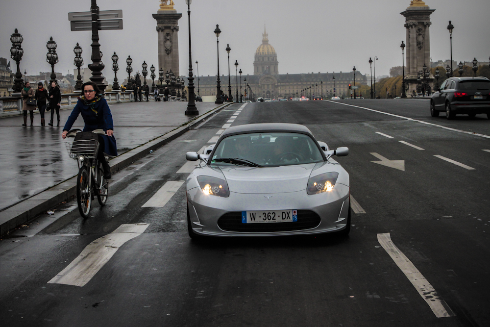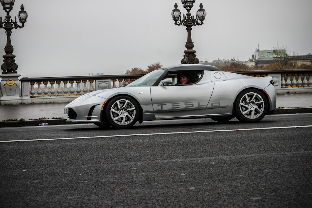 Tesla Motors propose 2 versions de son roadster 2.5. La version Sport diffère de la version standard en quatre points essentiels. Le design des jantes évolue et de nouveaux pneus Yokohama Advan plus performants apparaissent. La suspension de la version Sport est réglable (sur pont) en 10 positions contre 2 pour la version de base 2.5. La dernière modification porte sur la programmation de la cartographie moteur permettant de passer de 370 à 400 Nm de couple. Le 0 à 100 km/h est abattu en 3,7 secondes, soit avec un gain de 0,2 seconde par rapport au modèle standard 2.5. Et Karine compte bien utiliser ce couple de folie, disponible immédiatement à l’accélération et dès 0 tr/min. C’est bien la spécificité extraordinaire des voitures électriques, mais sans jamais atteindre les 201 km /h max que propose la machine. Nous sommes à Paris et l’essai a été réalisé dans le respect des règles de circulation.