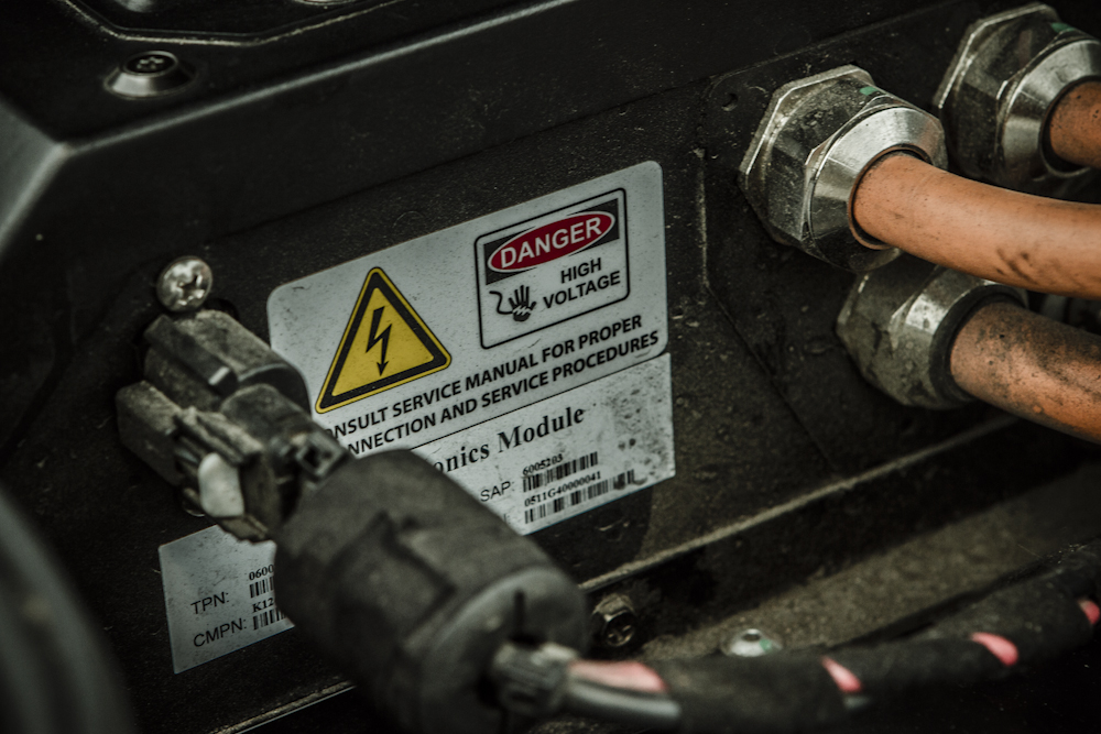Concentrons-nous sur le cœur de l’engin. Le petit moteur électrique (à induction triphasé, courant alternatif) de la Tesla Roadster ne pèse que 52 kilos. Il développe l’équivalent de 288 chevaux. Il est alimenté par des batteries exclusives à Tesla Motors, placées en position centrale arrière. Les 6 831 cellules lithium-ion forment un « pack » qui est le plus dense en énergie de toute l’industrie, avec 56 kWh d’énergie stockée. L’autonomie de l’auto est alors de 340 km. La voiture peut être rechargée à partir de n’importe quelle prise aussi simplement que vous le faites avec votre iPhone. Trois possibilités de mode de conduite s’offrent alors au volant, du plus puissant, le mode « Performance », au plus économique, le « Max Range ». Le 3ème mode disponible «Standard » est intermédiaire car il combine performance et économie de charge.