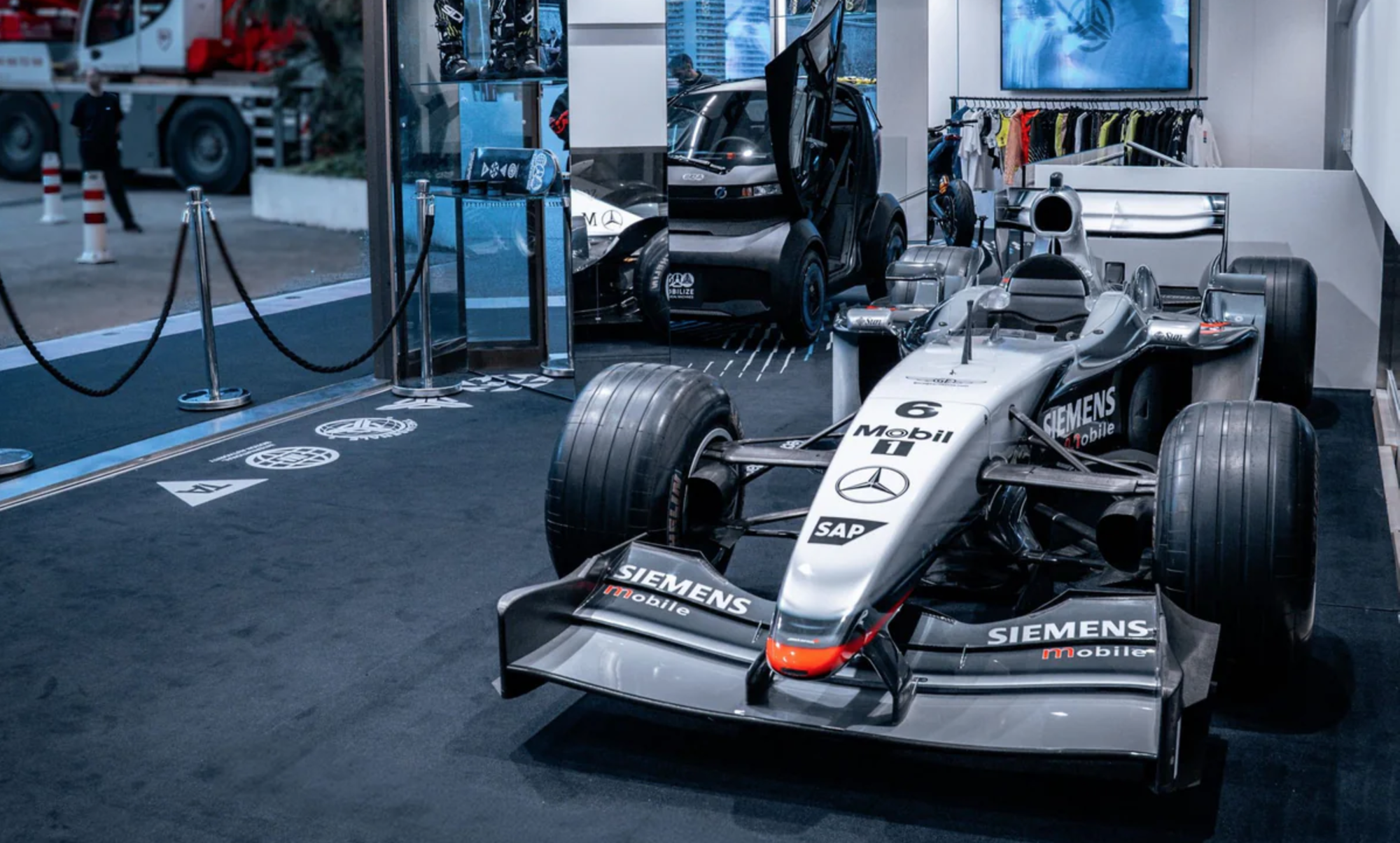 Une fois cette porte franchie, le concept‑store de Monaco apparaît comme un laboratoire du futur. On y découvre un sous‑marin voisinant avec une Bugatti, elle‑même exposée à côté d’un vélo électrique ultra-léger sorti de chez Ateliers HeritageBike. Précisons que cette Chiron remplace la monoplace de F1 Mercedes-AMG qui est présente sur la photo de couverture de ce sujet.