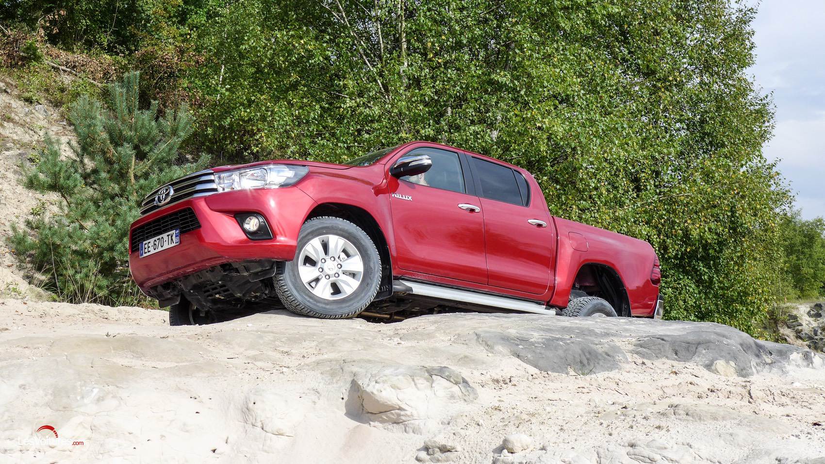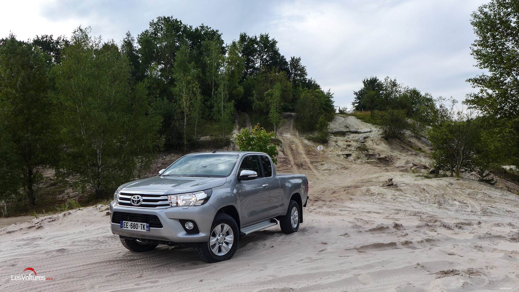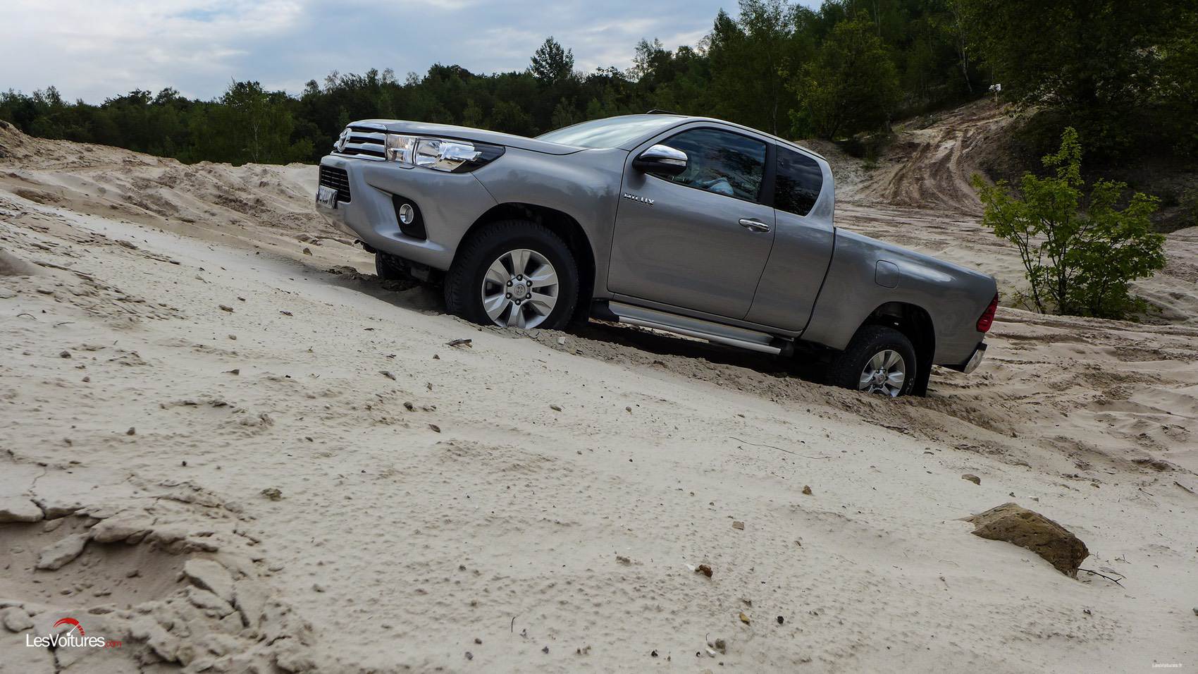 Une fois le tour du propriétaire effectué avec un instructeur, ce n’est pas sans une petite appréhension que nous avons été livré à nous-même pour affronter les obstacles sablonneux et autres pentes à 45° de cette carrière. Une fois le mode 4L de la transmission enclenché, nous nous en donnons à cœur joie en débutant nos aventures par une descente à couper le souffle. Grâce au système DAC de contrôle de la motricité en descente, il suffit de débuter l’interminable descente en première sans toucher à l’accélérateur ni au frein. A ce moment-là, l’Hilux gère tout seul la manœuvre avec une facilité déconcertante. Il suffit juste de se concentrer, sans avoir le vertige, sur le volant.