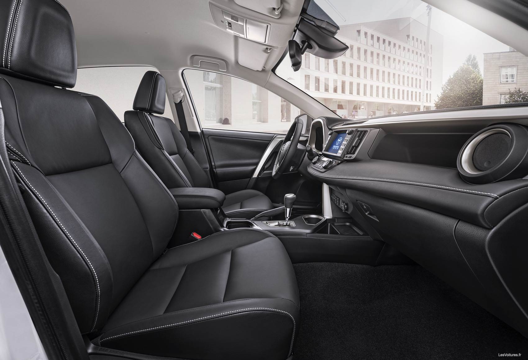 Au premier abord, comme le reste du parc SUV mondial, tout le monde prend de l’embonpoint au fil des années et le RAV4 n’allait pas y échapper. Malgré le fait que l’on s’éloigne toujours un peu plus du concept de base de mini SUV, le Toyota reste malgré tout compact de part ses portes-à-faux avant et arrière relativement courts. De plus, entre la ligne très tendue du pavillon et la garde au sol raisonnable, le 4×4 nippon ne se présente pas parmi les grosses armoires normandes que l’on peut rencontrer au NAIAS (North American International Auto Show) de Detroit. Une fois à l’intérieur, le niveau de finition de la version Lounge ne déçoit pas et offre des matériaux de qualité adaptés à un dessin de la planche de bord très épuré.