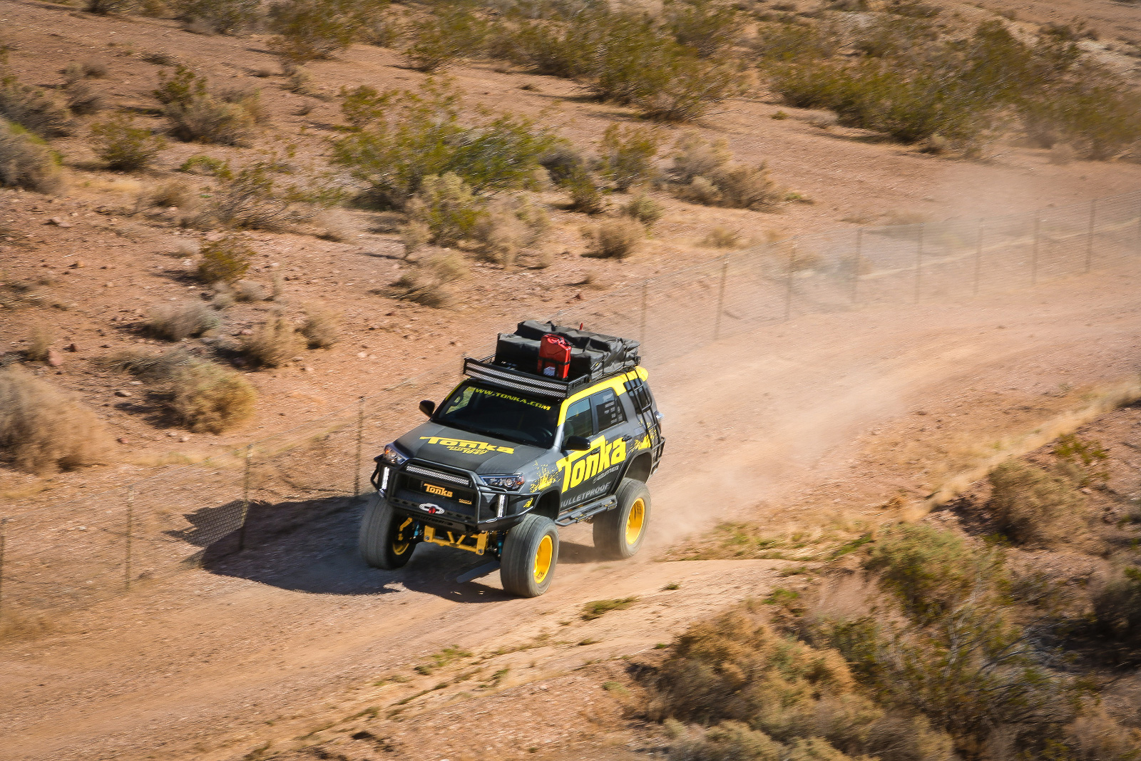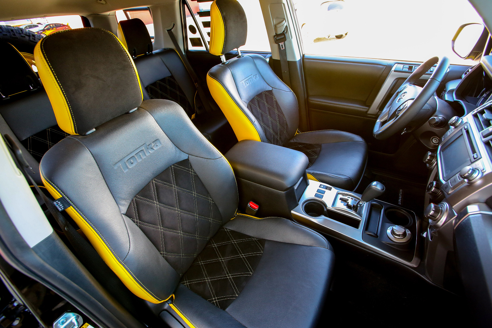 Esthétiquement, le concept Toyota Tonka 4Runner Concept reprend les éléments des voitures Tonka comme les pare-chocs renforcés, les marchepieds latéraux ou encore l’échelle et la galerie de toit qui intègre une tente pop-up. Ce « Toy for boys » est campé sur des énormes jantes Ultra Wheel Colossus de 20″.Et les suspensions hautes ont été fournies par Bulletproof.