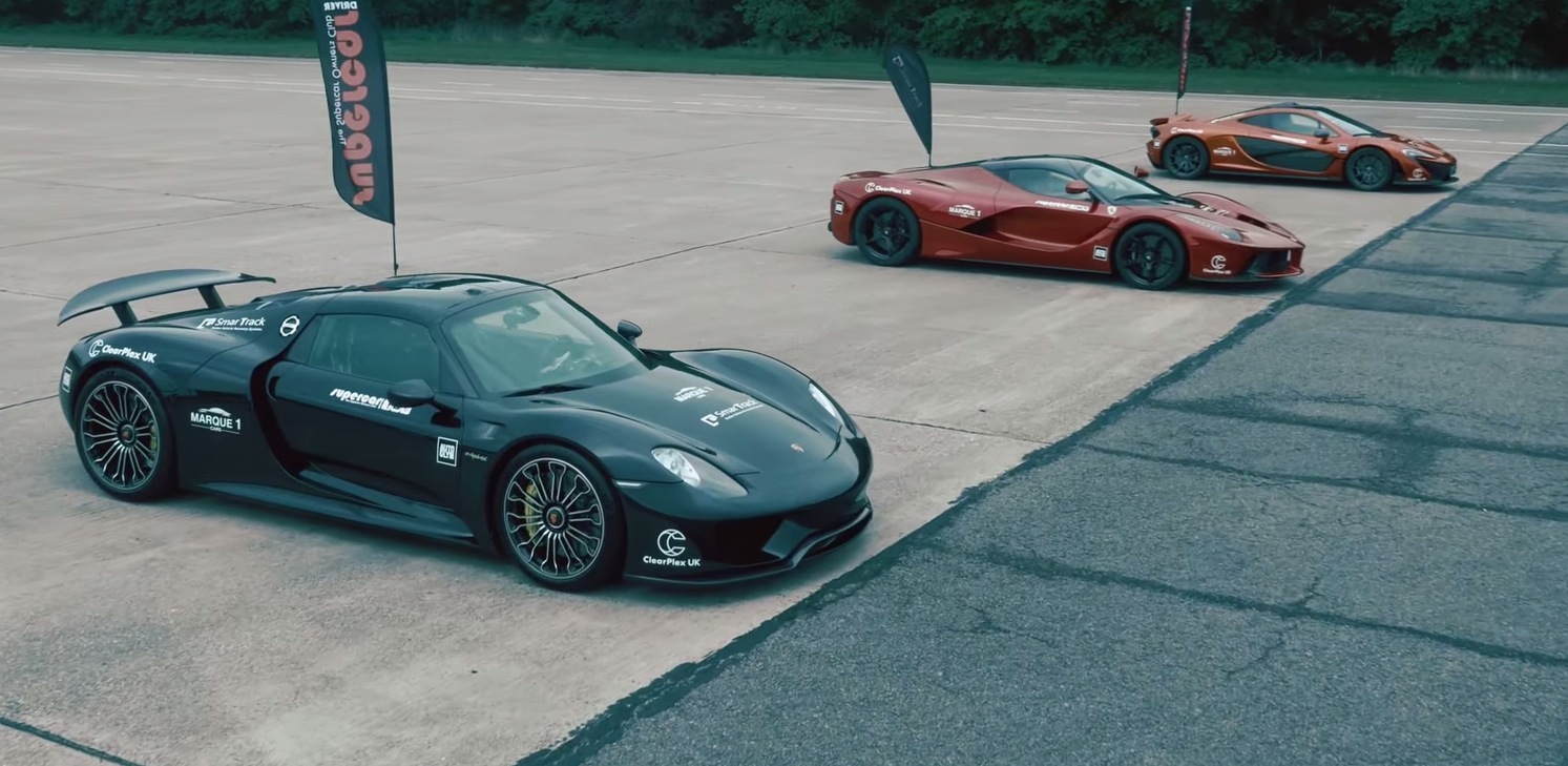 Une Hypercar italienne face à une allemande et une britannique, voici un duel qu’on ne se lasse pas d’observer. D’ailleurs l’un d’entre eux est programmé dans l’un des premiers épisodes du futur magazine du trio composé de Jeremy Clarkson, Richard Hammond et James May. Ce comparatif entre Hypercars sera diffusé sur Amazon Video en 2016. En attendant ce duel concocté à la sauce « So British », TheSUPERCARDRIVER a organisé une « Drag Race » entre la Ferrari LaFerrari (963 ch), la McLaren P1 (916 ch) et la Porsche 918 Spyder (887 chevaux). Rappelons que cette dernière dispose, contrairement aux deux autres, de la transmission intégrale. Qui l’emportera ? La réponse en cliquant sur « Play » ci-dessous.
