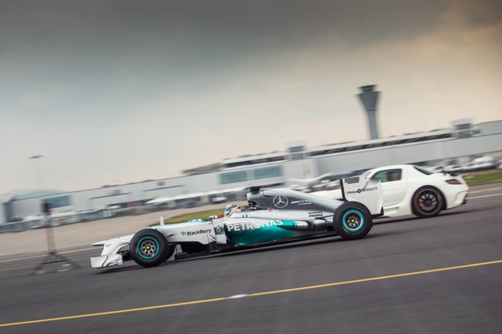 L’aéroport d’Edimbourg en Ecosse n’est pas le plus important du Royaume-Uni mais, début septembre, il a accueilli une horde de Supercars, plus puissantes les unes que les autres. Mercedes-Benz a fait le show avec sa gamme AMG et pour couronner le tout, la Mercedes AMG Petronas W03 de 2012, pilotée par Anthony Davidson, s’est jouée de la piste d’envol ! Pour décoller, et entendre le vrai bruit d’une Formule 1, cliquez sur « Play » ci-dessous.