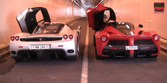 Comparons les vocalises de deux générations de Ferrari avec les Enzo et LaFarrari ! Au total, ce sont 1 623 chevaux que Marchettino a réussi à réunir, dans un tunnel, pour une battle entre les 660 chevaux de l’Enzo et les 963 de LaFerrari. L’Enzo, à gauche, est motorisée par un V12 de 6,0 litres dont la zone rouge est fixée à 8.000 tr/min. A sa droite, un autre V12 mais de 6,3 litres de l’hypercar LaFerrari, qui peut atteindre 9.000 tr/min. que la battle commence !