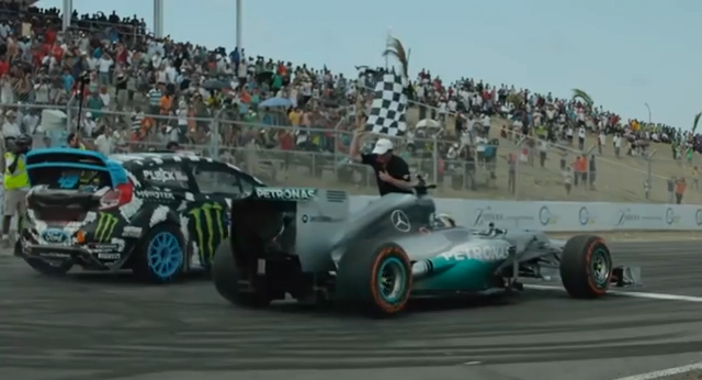 Lors de l’ouverture du championnat Global RallyCross en partenariat avec le Top Gear Festival 2014, Ken Block a défié Lewis Hamilton à la Barbade ! Block était bien sûr au volant de la Fort Fiesta ST RX43 tandis que le leader de championnat du monde de F1 2014 était aux commandes de la Mercedes AMG F1 W04 de 2013. Et cette dernière n’est pas habituée à la terre… Voici : « 43 Seconds with Ken Block – F1 car vs. Fiesta ST RX43, GRC Barbados heat wins, and a unreal crash », une vidéo Ford Racing.