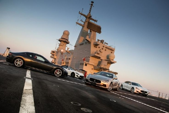 Après Lamborghini qui avait « squatté » le porte-aéronefs Cavour, positionné dans les Emirats Arabes Unis, pour promouvoir la Veneno, Maserati s’est offert le pont d’envol du navire de l’armée italienne pour présenter toute sa gamme. On retrouve ainsi les Maserati Ghibli, Quattroporte, GranTurismo et GranCabrio MC, prêtent à décoller. A voir ci-dessous.