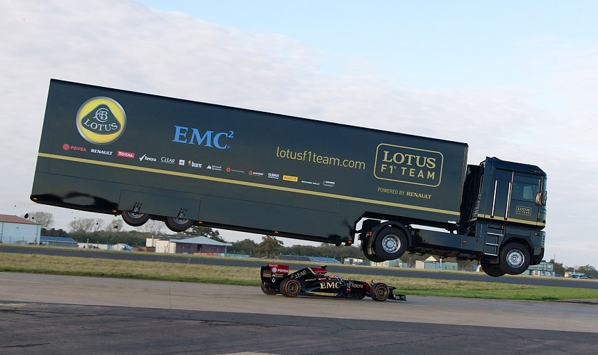 Incroyable mais vrai ! Le partenaire technologique du Lotus F1 Team, EMC, spécialiste du matériel de stockage informatique et des solutions Cloud a fait s’envoler un camion de l’écurie au-dessus d’une F1 ! A noter que Mike Ryan, vainqueur 12 fois de la course de Pikes Peak, était au volant du poids lourd devenu « poids plume » !