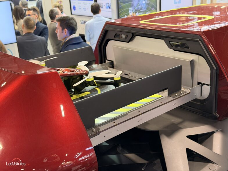 Mais l’innovation la plus marquante se trouve sur le toit : une drone box intégrée, abritant un drone compagnon et plusieurs antennes de connexion. Pilotable depuis la plate-forme de commandement mobile située à l’arrière, ce drone retransmet ses images sur deux écrans intégrés à une tablette coulissante.