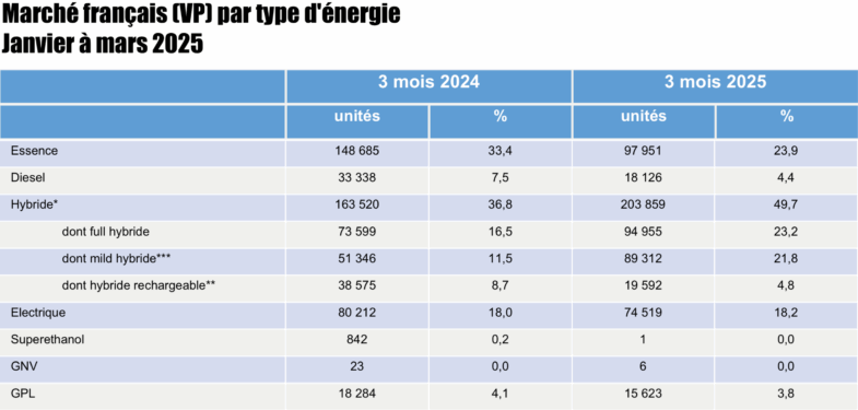 Sur les trois premiers mois de l’année 2025, de janvier à mars, selon le CCFA (Comité des Constructeurs Français d’Automobiles), les voitures diesel représentent, sur le marché des VP (Véhicules Particuliers), seulement 4,4 % de parts de marché, contre 18,2 % et 4,8 % respectivement pour les voitures électriques et les modèles hybrides rechargeables PHEV (Plug-in Hybrid Electric Vehicles), ces derniers étant, d’ailleurs, de moins en moins plébiscités par les acheteurs d’une voiture neuve. Cette situation pourrait donc évoluer pour les voitures diesel, pour les raisons évoquées en introduction, ainsi que d’autres, sachant que, pour les voitures électriques neuves, les acheteurs devront payer le prix fort la carte grise, dès le 1er mai prochain, ce qui n’était pas le cas auparavant.