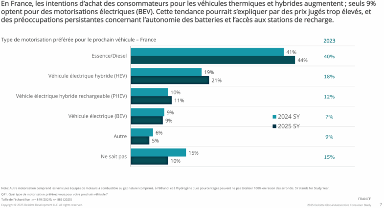 Ainsi, comme évoqué en introduction, 9 % des Français souhaiteraient passer à la mobilité électrique pour leur futur véhicule. Pour être absolument transparent et factuel, l’étude en question de 46 pages peut être téléchargée gratuitement (format PDF), en cliquant sur : « 2025 Global Automotive Consumer Study -Focus France ».