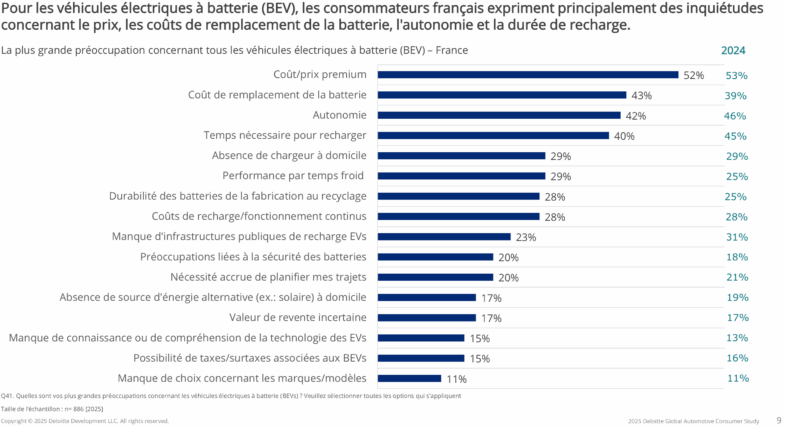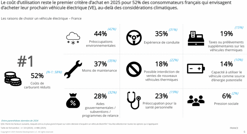 Enfin, terminons par une note positive, ou presque, en indiquant, même si ce chiffre est en baisse comparativement à 2024, que 52 % des Français estimeraient que le coût d’utilisation d’un BEV représenterait le critère N°1 d’achat de l’une des voitures électriques présentes sur le marché automobile.