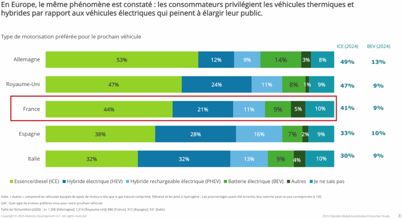 Revenons plus en détail à l’étude du cabinet Deloitte, sachant qu’au niveau européen, chez nos proches voisins, un certain désamour pour les voitures électriques est aussi à noter. Les Allemands souhaiteraient acheter un véhicule 100 % électrique à hauteur de 14 %, alors que pour la France, l’Espagne, le Royaume-Uni et l’Italie, on est en deçà des 10 %.