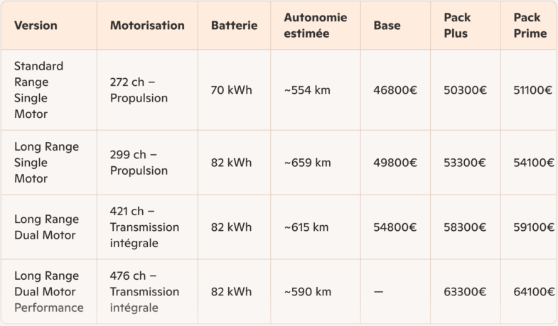 Trois niveaux de finition sont proposés, avec un prix de départ de 46 800 €. En face, la Tesla Model 3 débute à 40 333 €, signalant une concurrence frontale sur le rapport prix/technologie.