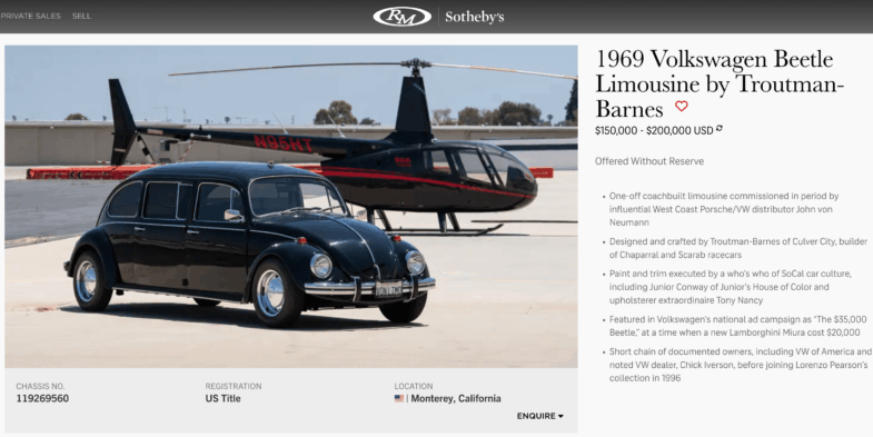 Cette improbable et réussie Volkswagen Coccinelle Limousine « Rollswagen » a été conçue tel un projet fou signé Porsche et Volkswagen. Commandée par John von Neumann, distributeur Porsche et Volkswagen sur la côte Ouest des États-Unis, cette transformation a coûté environ 32 000 € à l’époque (soit près de 17 fois le prix d’origine de la Coccinelle, qui valait alors environ 1 900 €). Le chantier a été confié à Troutman-Barnes, réputé pour ses voitures de course Chaparral et Scarab, mais aussi pour avoir conçue une Porsche 911 à quatre portes.