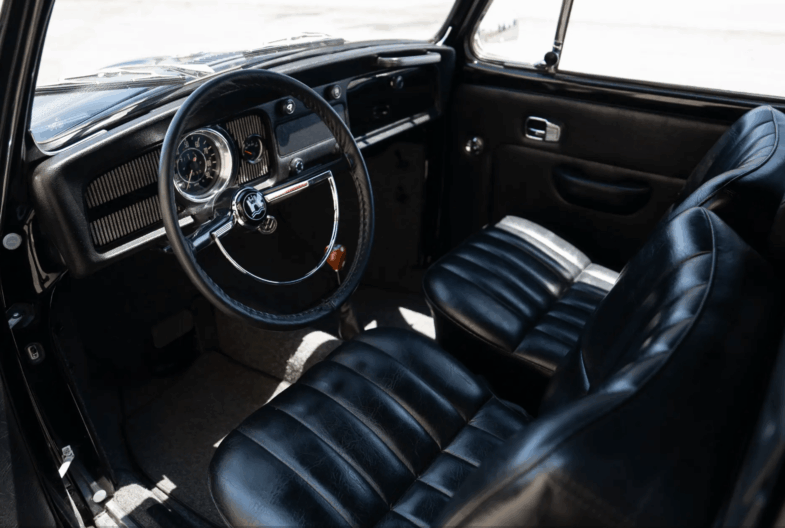 Concernant le moteur de cette Coccinelle Limousine, il a été changé pour compenser le poids. Ainsi, le moteur d’origine, un 4-cylindres de 1,5 l a été remplacé par un bloc de 1,6 l équipé de carburateurs Weber de 48 mm, afin de compenser les 181 kg supplémentaires dus à la transformation en « Rollswagen ».