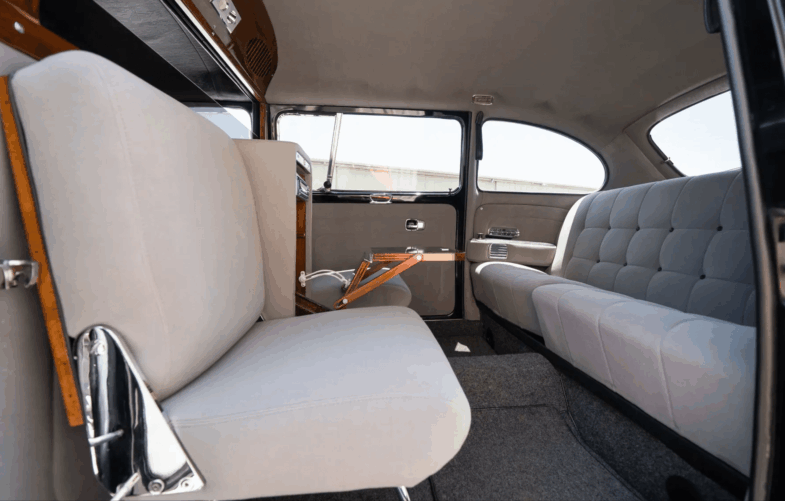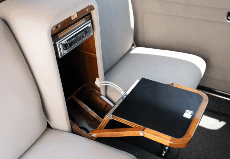 L’intérieur de cette « Rollswagen » est donc digne d’un salon roulant. À l’arrière, on trouve une banquette grise, deux strapontins, un minibar avec table escamotable, des boiseries en acajou, une cloison électrique, un interphone, une isolation phonique, des vitres électriques, et un système audio Philips à cinq haut-parleurs avec lecteur cassette. Un équipement Kenwood plus moderne avec chargeur CD a été ajouté plus tard.