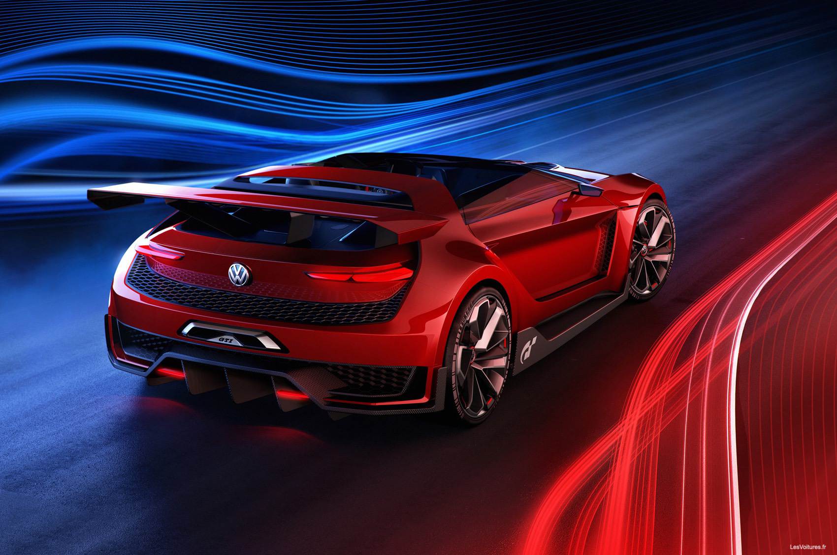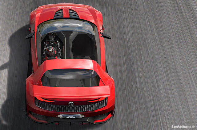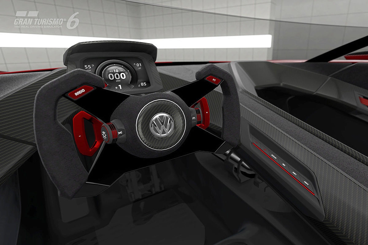 La Golf ainsi revue et corrigée devient un speedster ultime. Pour obtenir ce résultat, le bureau du style de chez Volkswagen, en partenariat avec Polyphony Digital, a accentué les dimensions des voies du bolide tout en réduisant son regard. La suite, l’apparition d’ouïes sur le capot, l’intégration d’un cockpit biplace et l’ajout d’éléments aérodynamiques et mécaniques aussi efficaces sur l’asphalte que beaux : spoiler, sortie d’échappement central et aileron arrière surdimensionné. Sans oublier les grosses jantes de 20″, le retrait du toit et une couleur volcanique comme ce qui se cache sous le capot du concept GTI Roadster Vision Gran Turismo. Le petit logo GTI, qui apparaît à l’avant de l’auto, marque cette « sulfureuse héritière » issue de la lignée des Golf GTI.