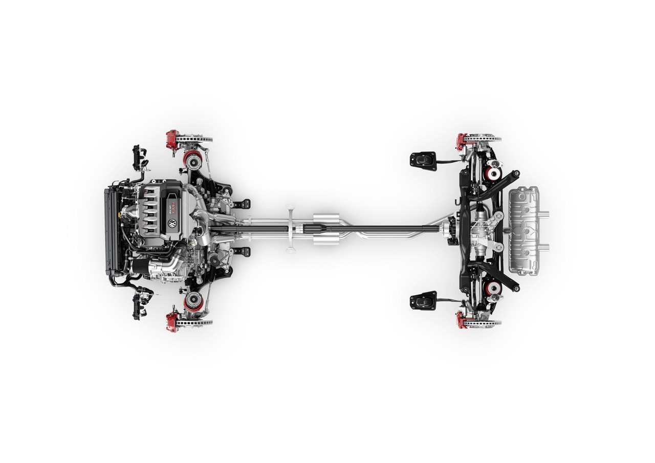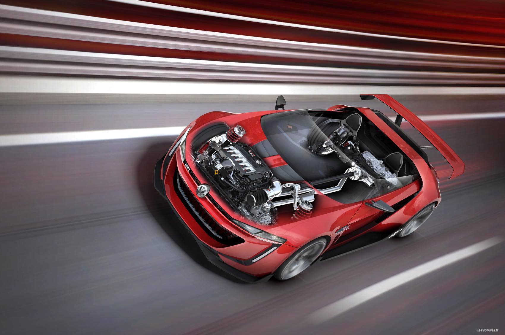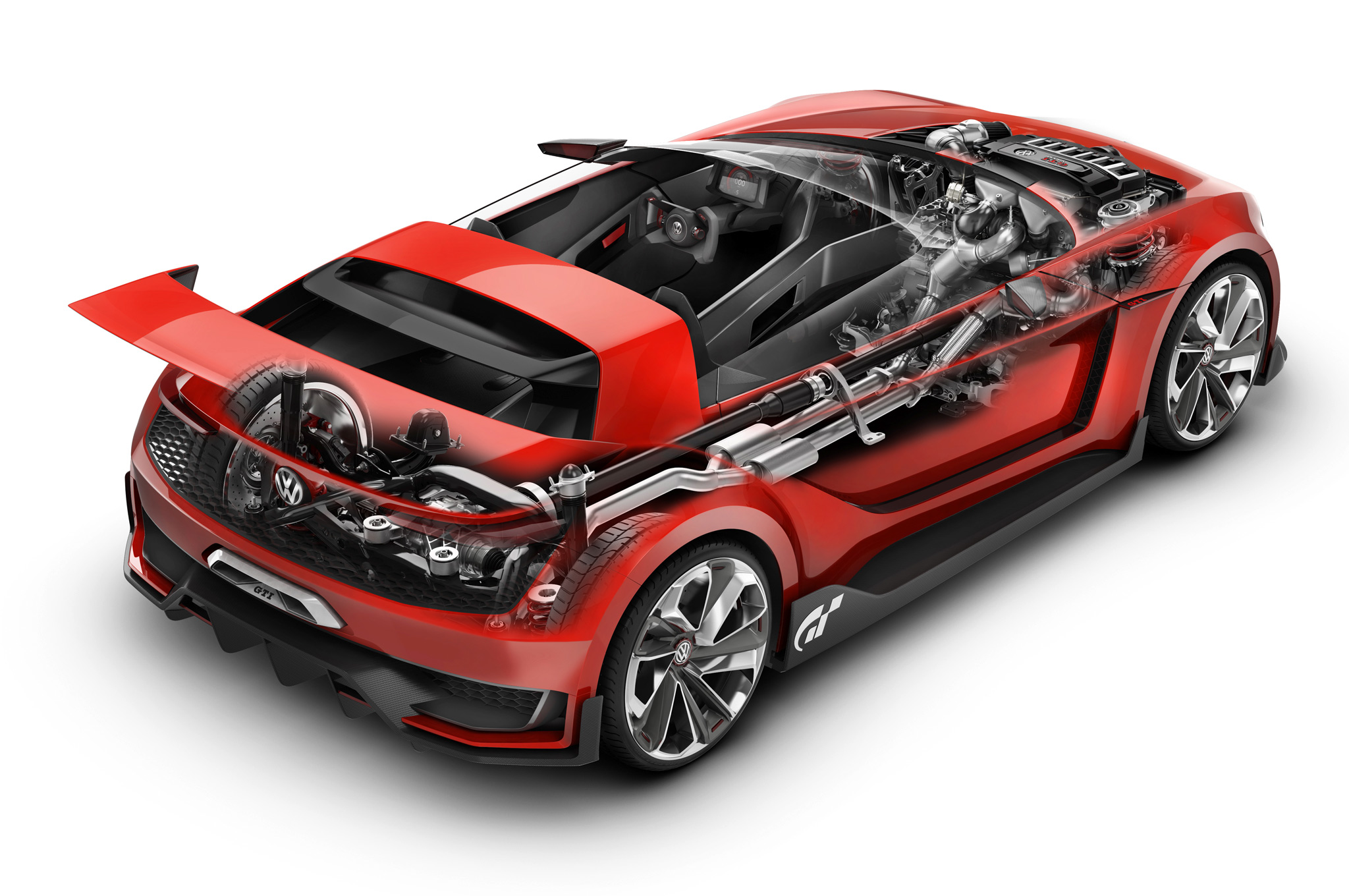 En effet, 503 chevaux animent le roadster que l’on interprète plus comme un speedster. Ils sont obtenus grâce au moteur 3,0 litres V6 TSI (VR6) biturbo. Et ce ne sont pas moins que 665 Nm de couple qui arrachent le monstre au bitume. Dotée de la transmission transmission intégrale 4Motion et d’une boîte automatique double embrayage à 7 rapports DSG, la Volkswagen GTI Roadster Vision Gran Turismo n’a alors plus rien de virtuel et les infographistes allemands ont même fait l’effort de présenter très précisément les entrailles du monstre.