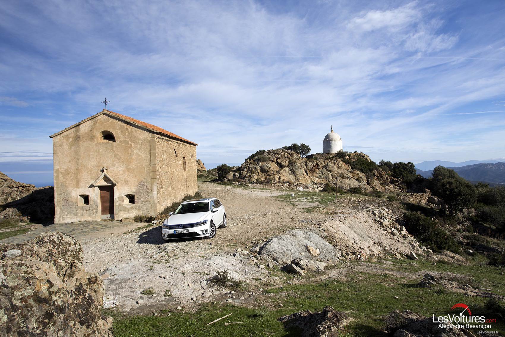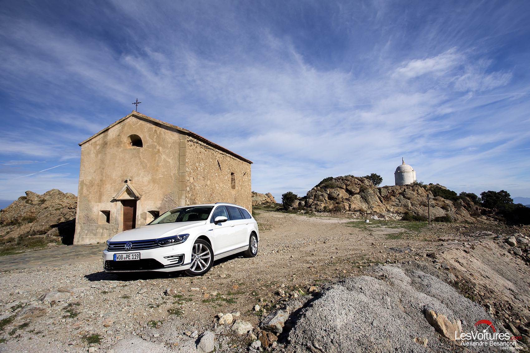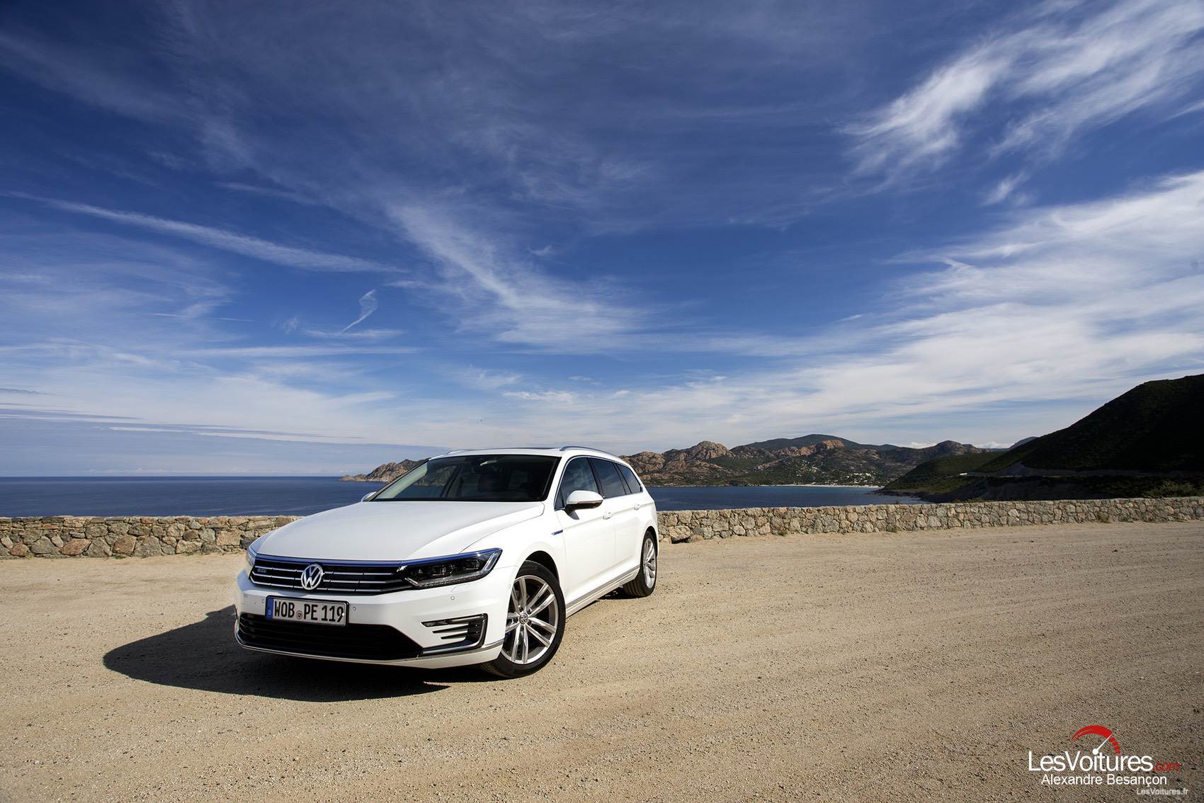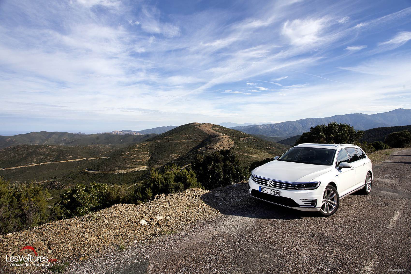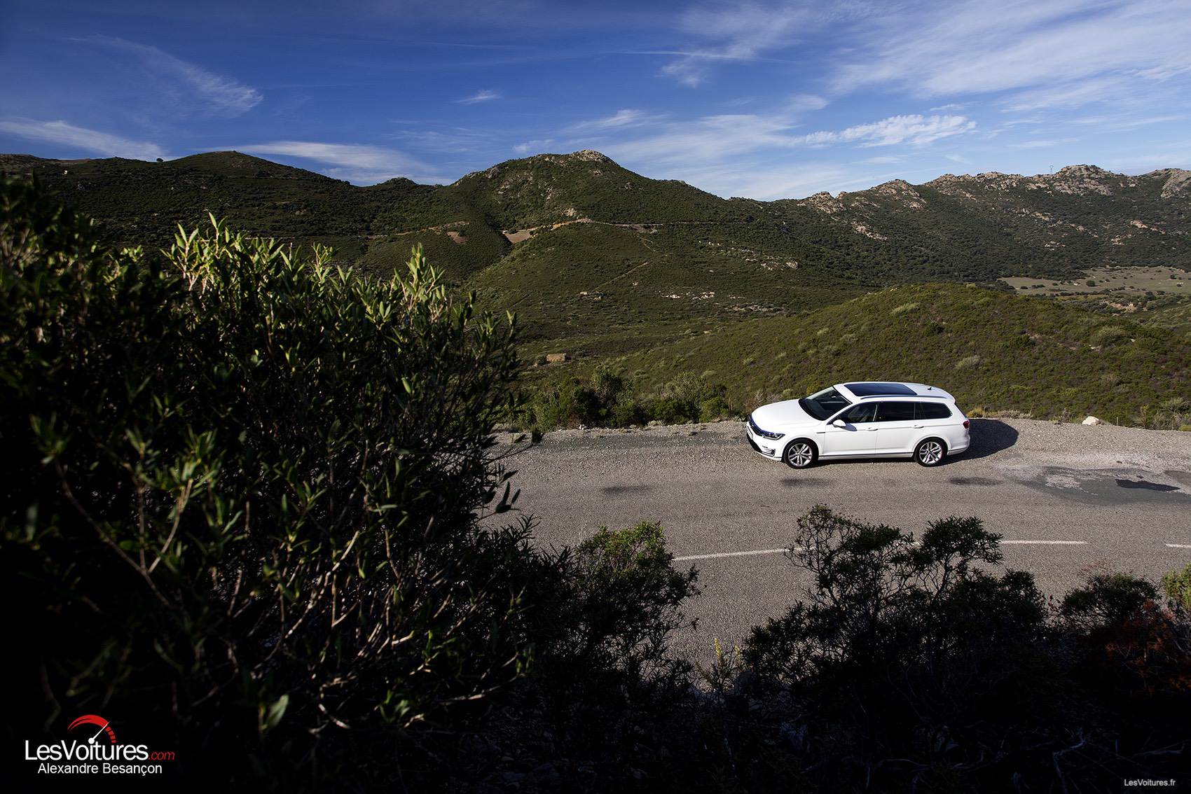 De ce fait, lorsqu’on enfonce la pédale de droite, peu importe le régime moteur, la Passat GTE décolle ! Ses reprises sont excellentes et permettent d’envisager les dépassements sans aucun souci. On y verrait même un caractère sportif, confirmé par l’insigne GTE. Puisque nous sommes en Corse, voyons donc de quoi ce break « hybride sportif » est capable ! Malheureusement, les ardeurs de la mécanique sont vite tempérées par un train avant très lourd (il supporte une bonne partie des éléments liés au moteur électrique), entraînant un sous-virage assez prononcé. Il faut dire que l’engin pèse tout de même plus de 1700 kg, soit une centaine de kilos de plus que sa sœur baroudeuse, la Alltrack. Une fois cette donnée prise en compte et la conduite adaptée, la Passat GTE offre un grand plaisir de conduite, avec un freinage endurant (permettant également de recharger partiellement les batteries) et des performances étonnantes pour son gabarit. La vigueur du moteur électrique vous projette au virage suivant, bien aidé par un antipatinage efficace et peu intrusif. Le 0 à 100 km/h est d’ailleurs abattu en 7,4 s pour la berline et 7,6 s pour la version SW.