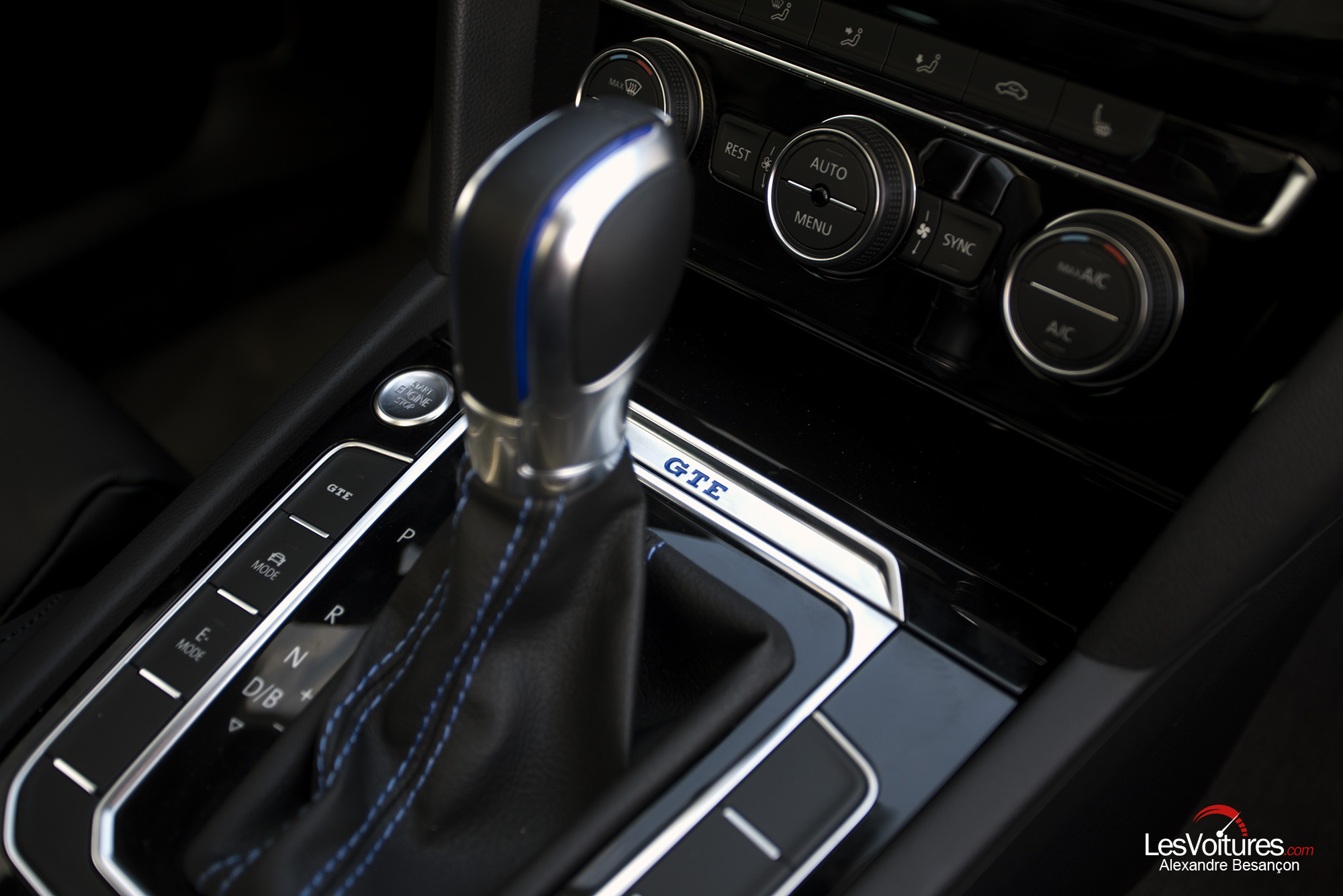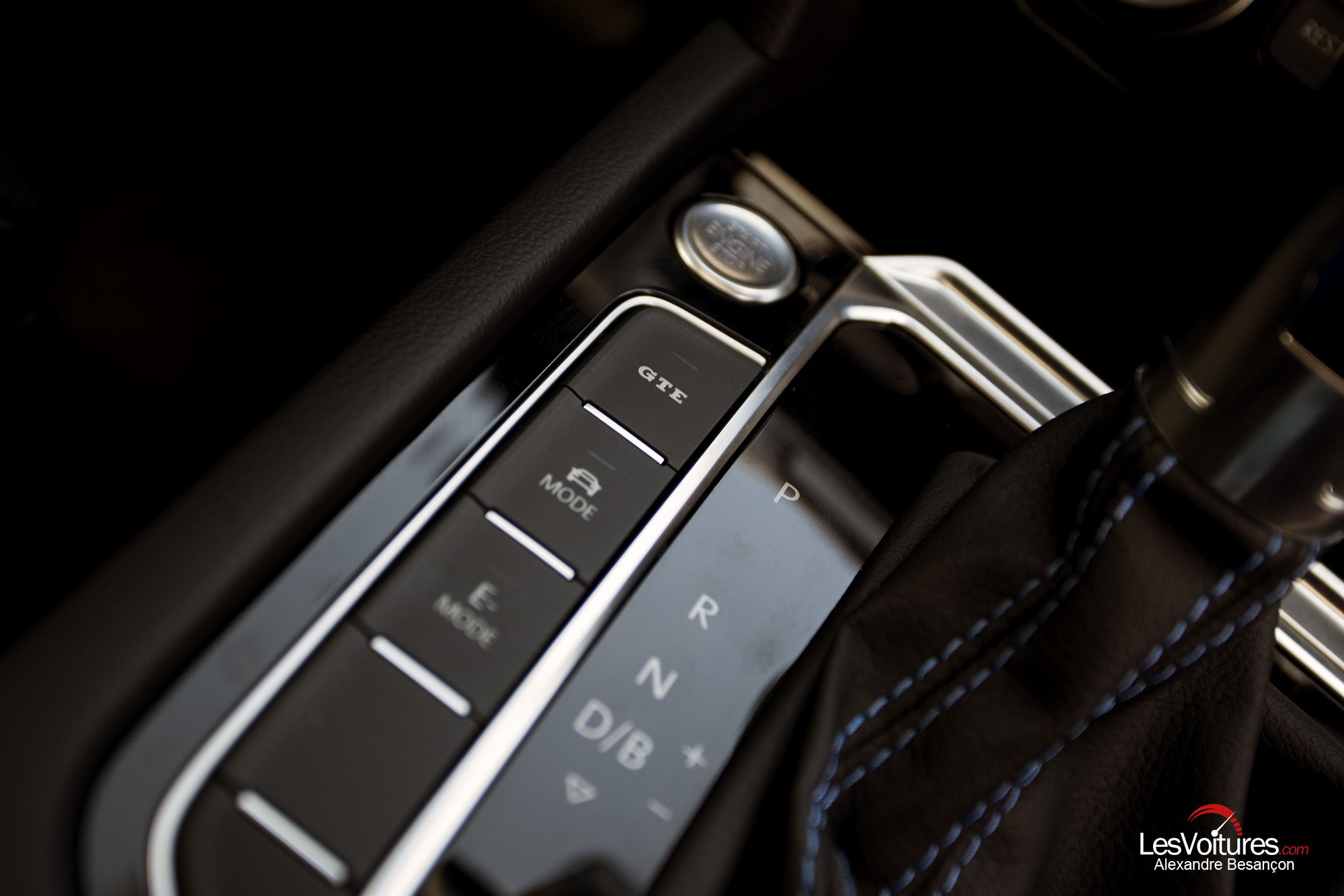 Libre à vous, par la suite, de changer le mode de conduite vers un mode hybride classique. Ou encore, de presser le petit bouton magique près du levier de vitesses : GTE. Ces trois lettres transforment radicalement le tempérament de celle que l’on voyait jusque-là comme un véhicule quasi-utilitaire, vous emmenant au travail silencieusement et permettant d’emmener la famille en vacances sans arrière-pensée. Lorsque le mode GTE est enclenché, le moteur thermique de 156 ch (l’excellent 1.4 TSI) et le moteur électrique de 115 ch travaillent de concert afin d’offrir une puissance maximale de 218 ch ! Le couple atteint également 400 Nm. Ceux qui ont déjà eu la chance de prendre en main un véhicule électrique comprendront que ces données ne reflètent qu’une partie du caractère de ces deux propulseurs. En effet, le moteur électrique a pour particularité d’offrir une puissance instantanée !