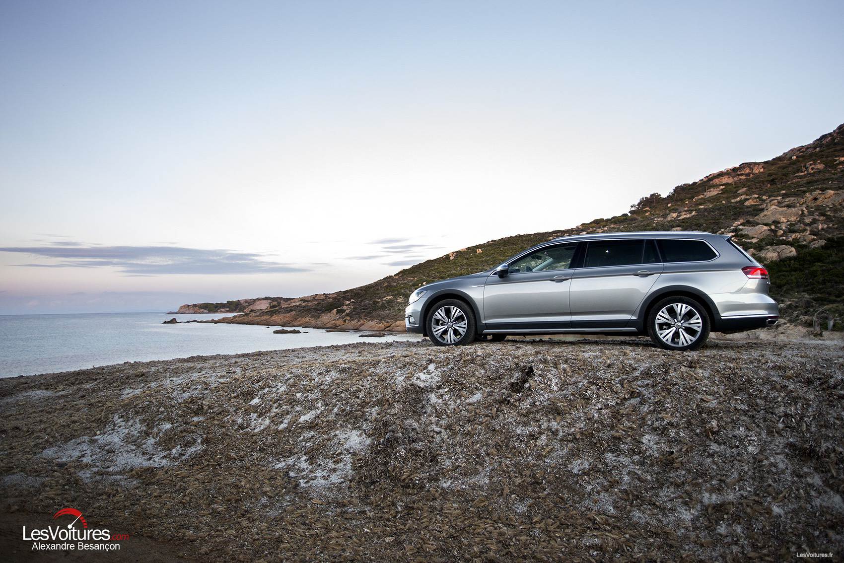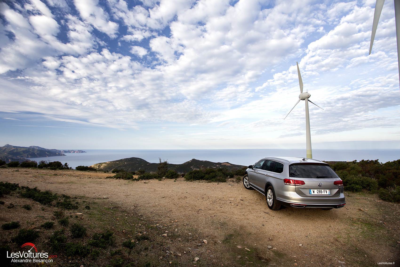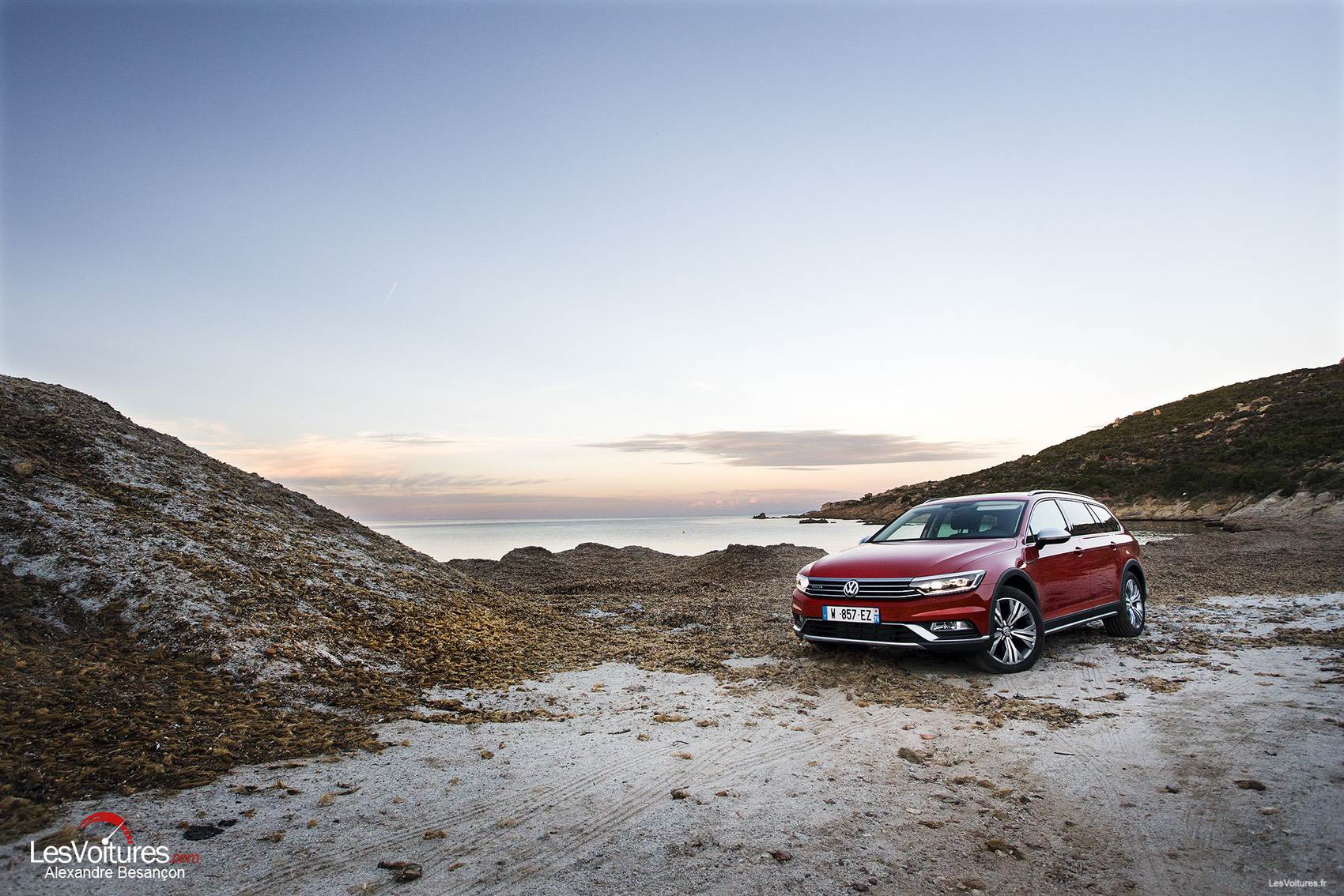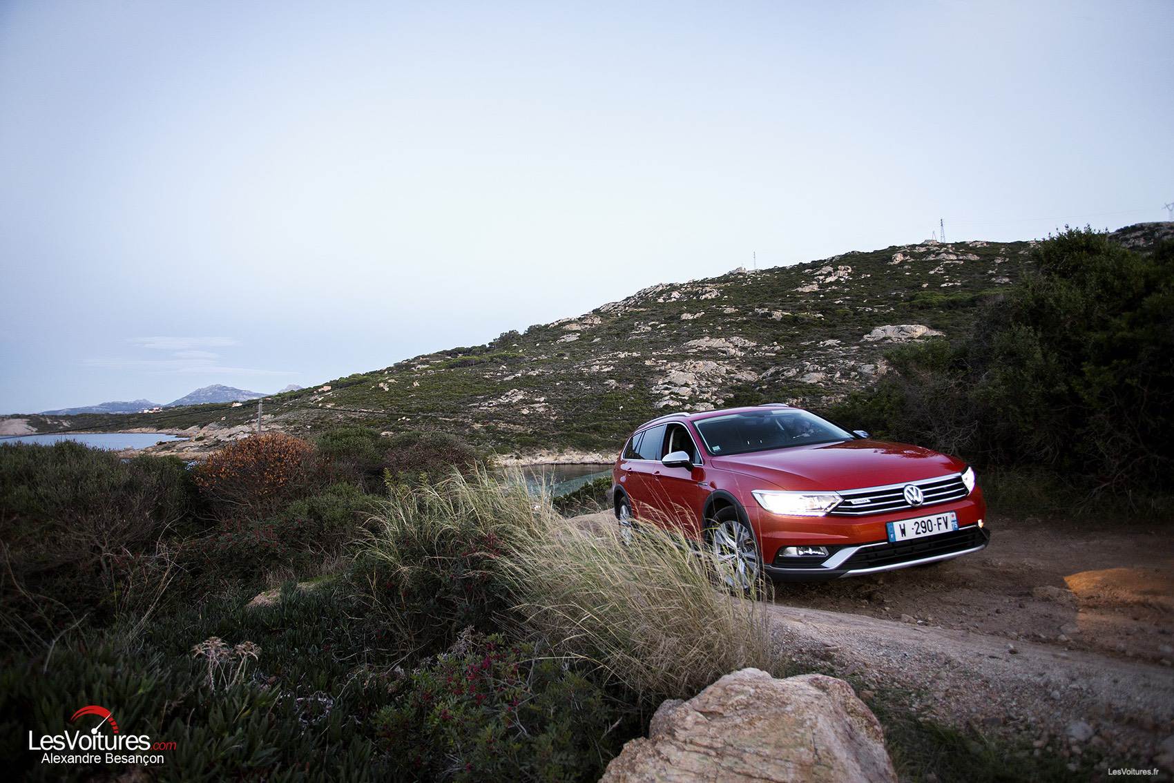 Commençons par celle qui nous permettra d’explorer les recoins les plus secrets de l’Ile de Beauté, la Passat Alltrack. La recette est simple et inspirée des cousines Audi Allroad. Prenez un break familial, ajoutez la transmission intégrale 4Motion, surélevez-le de 27,5 mm et dotez-le des derniers raffinements en termes d’électronique « offroad » et enrobez-le tout avec de nouveaux habillages afin d’associer le plumage au ramage et vous obtenez une Passat Alltrack.