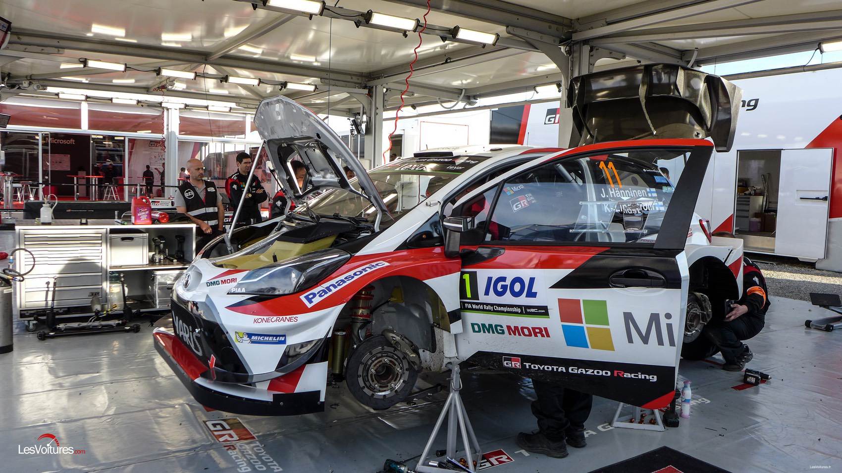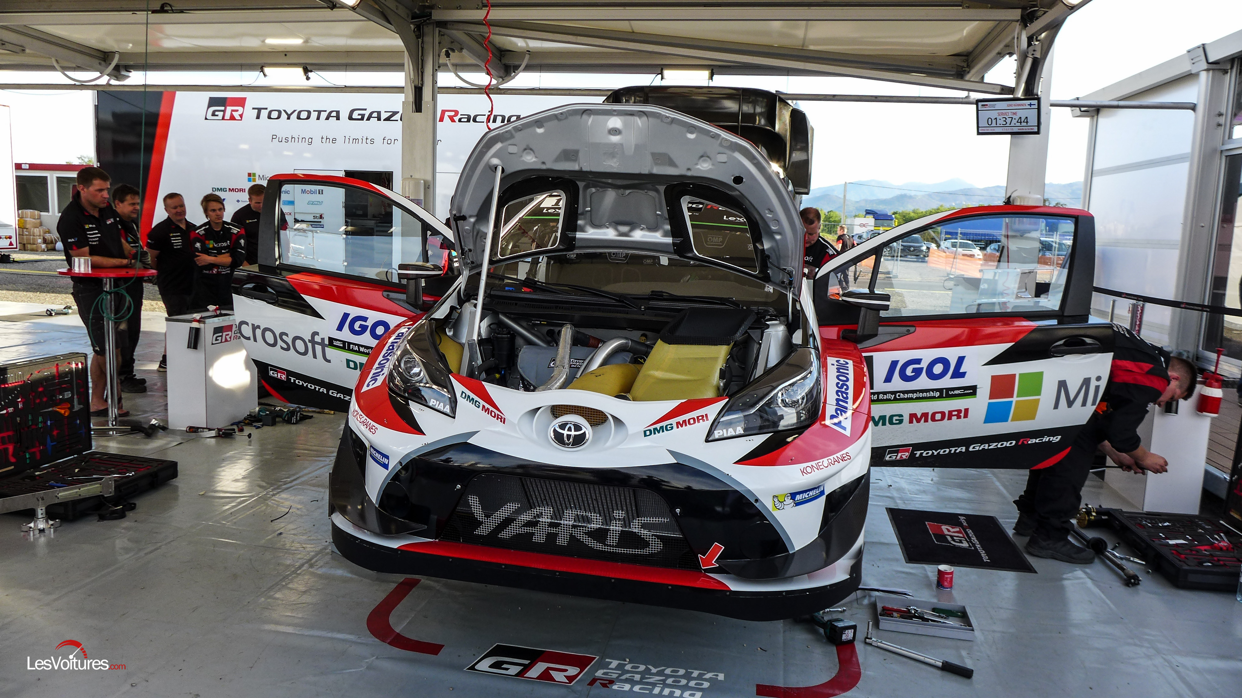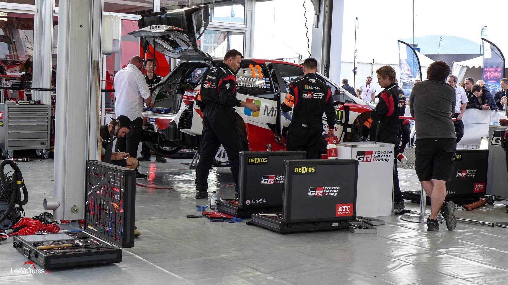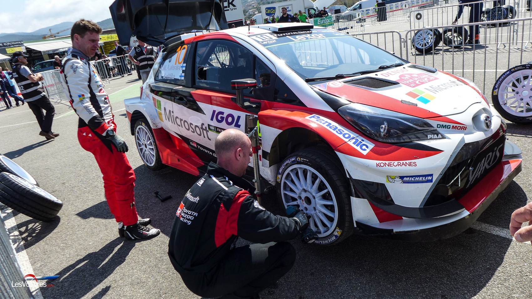 Avant l’ES3 du vendredi après-midi (Pietrosella – Albitreccia 2), Spéciale parcourue une première fois par les World Rally Cars le matin, nous assistons au changement de pneus de la Yaris WRC pilotée par Jari-Matti Latvala, dont le copilote est également finlandais en la personne de Miikka Anttila. L’opération est effectuée par l’équipage en toute décontraction, et avec l’aide d’un seul mécanicien sur un parking juxtaposé à divers commerces, presque comme un automobiliste lambda qui aurait crevé. Seules des barrières séparent des spectateurs calmes et très respectueux du travail qu’ils sont en train d’observer avec passion. Précisons que, lors du rallye, le règlement autorise l’utilisation de 32 pneumatiques mais seulement 26 sont prévus par le team japonais.